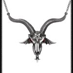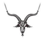 A breath-taking statement necklace that will be sure to add dark drama to any attire. A large Baphomet Skull necklace with red Austrian crystal eyes.