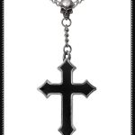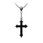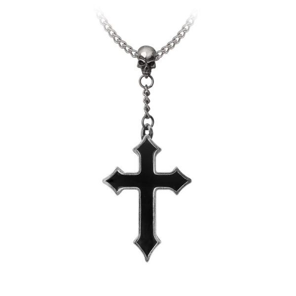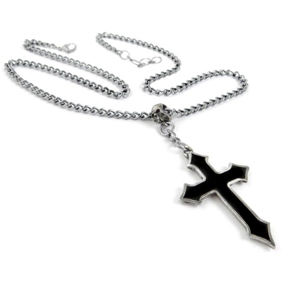 Pewter pointed cross infilled with black enamel. Suspended, rosary style from a pewter skull on a curb chain.