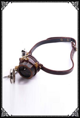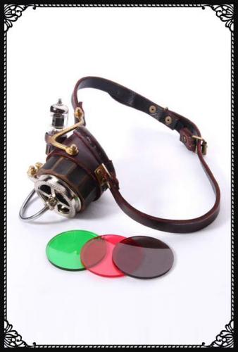 Handmade single eye googles made of real leather and cooper, Comes with 3 color lenses- green, red, transparent. Giant screw and gears on the glass, little light on the side of the glass constantly changing colour. A really nice strong glass case coming with it.